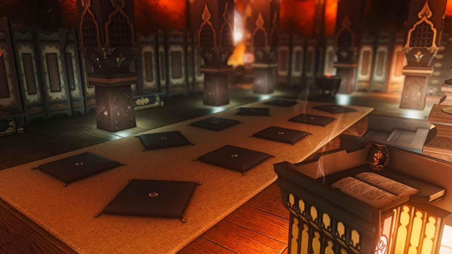 The main hall (Honden) will be where most sermons and sessions may take place. Here, all are welcome to find a spot upon the cushions or benches if they prefer. Standing is also welcome, of course. The Okami shrine attendants are there to offer assistance.